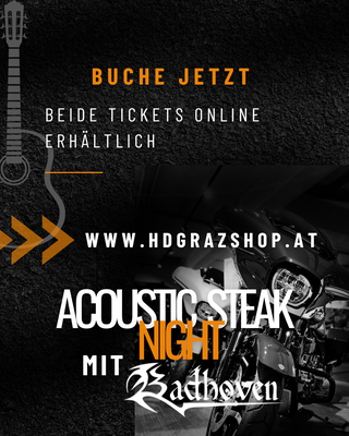 Gönn Dir an diesem Freitag ein After Work Programm das Genuss und gute Musik vereint! Verbringe ab 17Uhr ODER 18 Uhr einen schönen Abend in unserem Restaurant und lass Dir das eigens zusammengestellte Menü aus unserer neuen Küche schmecken. Ab 19.30Uhr kannst Du dann in unseren Harley-Davidson Shop an die Bar wechseln. Um 20Uhr tritt für Dich mit einem akustischen Rock Konzert die Grazer Band Badhoven auf. Zwischen Harleys und mit einem kühlen Drink in der Hand kannst Du die melodischen eigenen Songs von Badhoven als auch Coversongs von Rockhymnen genießen. Pur – Akustisch – Echt.